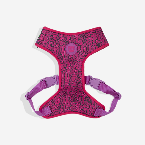 O peitoral Air Mesh Ajustável Brain para cachorros não esquenta pois possui trama aerada que permite a passagem de ar, refrescando a pele e o pelo do cachorro. É regulável tanto na barriga quanto no pescoço e possui anel para prender a guia na parte das costas. É recomendado evitar contato com superfícies ásperas ou cortantes. A estampa Brain, desenvolvida para a coleção Lords of Zee.Town, tem cores vibrantes e contrastantes. Conta com gráficos inspirados no mundo do skate, graffiti e street style.